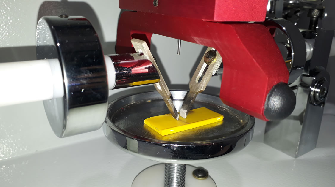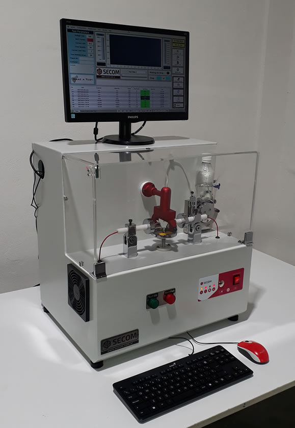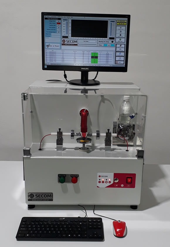 Nuestro equipo para el ensayo de Encaminamiento Electrico somete, a la muestra bajo ensayo una tensión de 0 a 1000 Vca por medio de dos electrodos con una carga de 1 Newton. Entre los electrodos gotea una solución conductora a intervalos regulares programados.