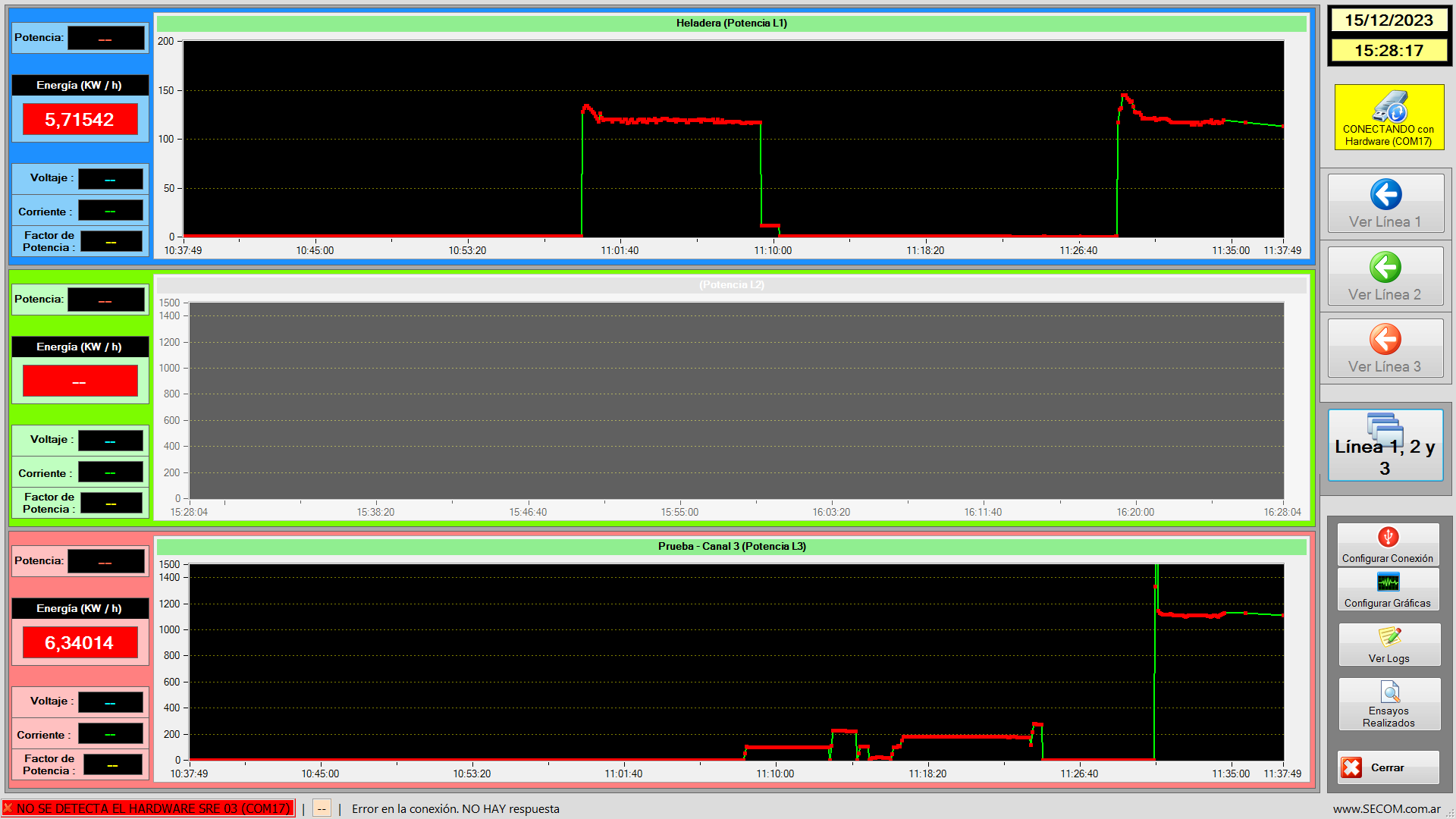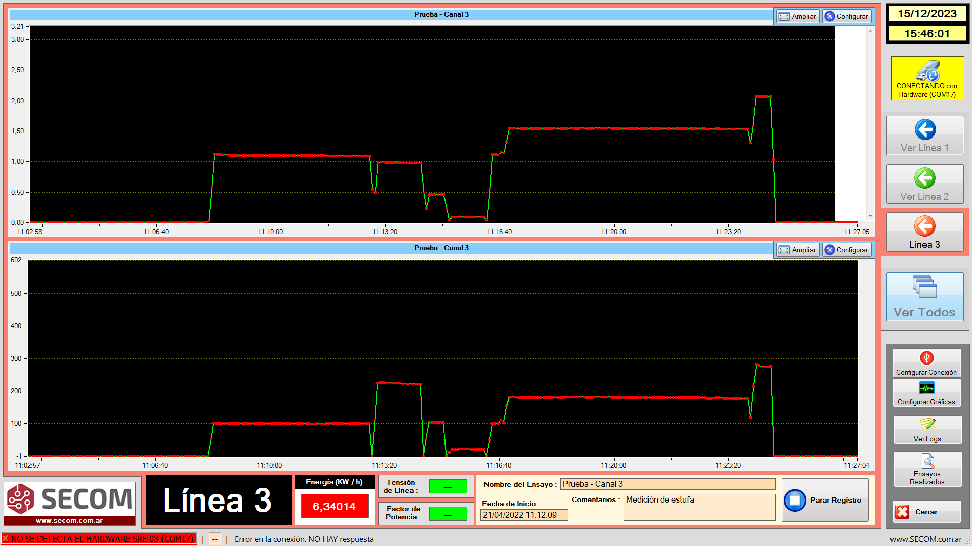 El sistema SRE 03 permite mostrar esos datos en gráficas, en pantalla (en tiempo real) y guardar en archivos dichos datos para generar reportes, análisis, imprimir o exportarlos.